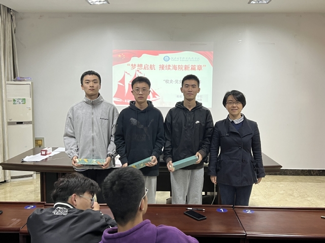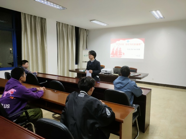 为迎接江苏海院建校70周年,重温学校波澜壮阔的发展历程,体会学校发展与国家命运深度融合的重要性,10月28日晚,船舶学院学生工作党支部在敏行楼203会议室组织开展了以“梦想启航,接续海院新篇章”为主题的党史校史知识竞赛。
