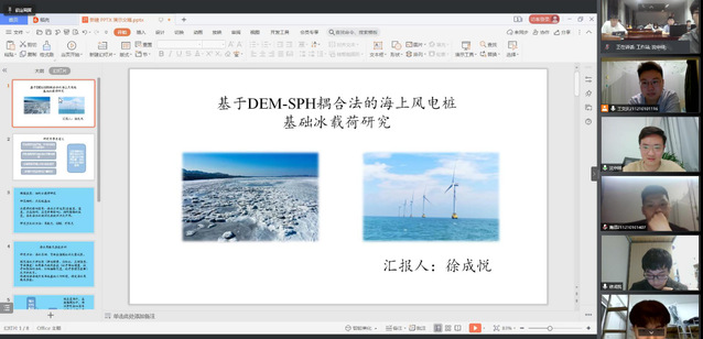 江苏科技大学研究生徐成悦就研究课题《基于DEM-SPH耦合法的海上风电桩基础冰载荷研究》作学术报告,介绍了海上风电桩基础冰载荷研究进展及研究方法,针对离散元参数对海冰力学性质的影响进行了深入介绍。