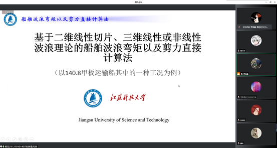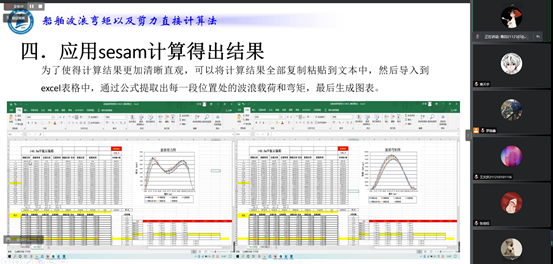 蒋印基于二维线性切片、三维线性或非线性波浪理论的船舶波浪弯矩以及剪力直接计算法,以140.8米的甲板运输船某一工况为例,分别从Maxsurf船体湿表面建模,船体质量分布, Patran划分有限元网格以及加载质量棒, Sesam分析计算以及数据后处理等方面详细讲解直接计算法流程。在提问环节,他和工作站成员一起探讨了切片理论相关知识,并解答了大家有关船舶弯矩以及剪力的基础知识。