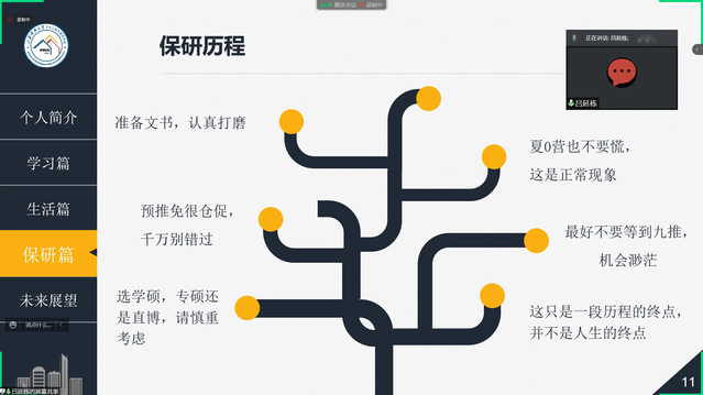 江苏科技大学土木工程专业吕延栋同学,作为保研直博到浙江大学的学生代表分享了他的成功经验。他从夯实专业基础、明确个人目标等方面,分享了近四年的江科大学习以及生活规划。他建议工作站的同学们在日常学习生活中要养成良好的作息时间,培养良好的个人兴趣爱好,用心完成个人学业任务,明确奋斗方向,保持初心,拒绝功利思维,专注提高自身学业学术修为。在提问环节,他细心讲解同学们提出的关于如何合理安排“一天计划”、学业规划和如何提升专业水平等问题。