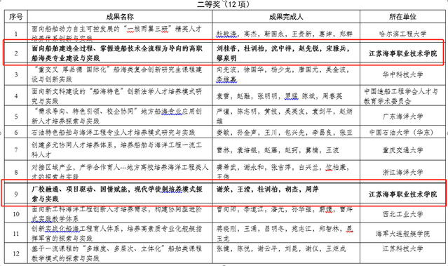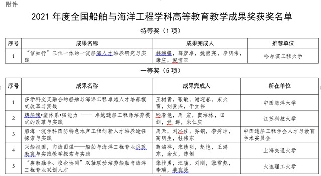 日前,中国造船工程学会官网公布了2021年度全国船舶与海洋工程学科高等教育教学成果奖评审结果,本次评选共评出1项特等奖,5项一等奖,12项二等奖。船舶学院报送的《面向船舶建造全过程、掌握造船技术全流程为导向的高职船海类专业建设与实践》《厂校融通、项目驱动、国情赋能,现代学徒制培养模式探索与实践》两个项目均获二等奖,这是继去年获中国造船工程学会科技进步二等奖后,再次获奖,两次均是唯一获奖的职业类院校,反映出我校在船舶与海洋工程领域较强的办学实力和影响力。