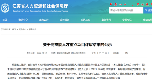 近期,省人力资源和社会保障厅网站公示了2022年高技能人才重点评审项目,经过南京市评选、江苏省评选和多轮现场考证,我校张强勇省级技能大师工作室顺利入围国家级技能大师工作室。