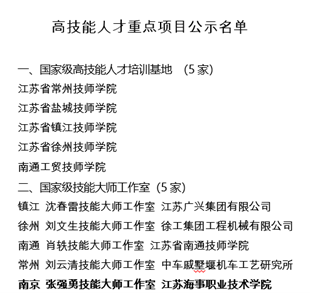 国家级技能大师工作室是高技能人才培养的重要载体,我校首次入选标志着技能人才培养进入了更高层次,我校也成为当前江苏高职院校唯一一个入选国家级技能大师工作室的院校。