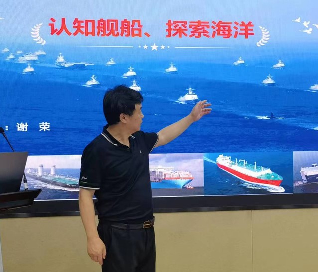 科普研学活动开始,江苏省首席科技传播专家谢荣教授给同学们带来了一场生动有趣的舰船科普小报告,让小同学们了解现代舰船,激发探索海洋的兴趣。