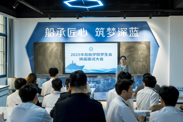 为加强学生骨干队伍建设,保障学生组织工作的持续健康发展,我院于2025年9月24日在一楼船舶馆顺利举行了团总支、学生会部门换届面试。学院党总支副书记戴雪头、学工办主任李慧蕾、团学负责老师谢璐及上一届团学骨干共同担任评委,并参与了本次活动。面试开始前,评委和老师们对上一届团总支、学生会的工作成果表示赞赏。戴雪头副书记充分肯定了学生组织在学院建设中的积极作用,并对新一届学生骨干的选拔寄予厚望,希望同学们展现出责任担当与实干精神。李慧蕾老师就学生工作的开展提出了具体要求,勉励大家在服务同学中锻炼成长。