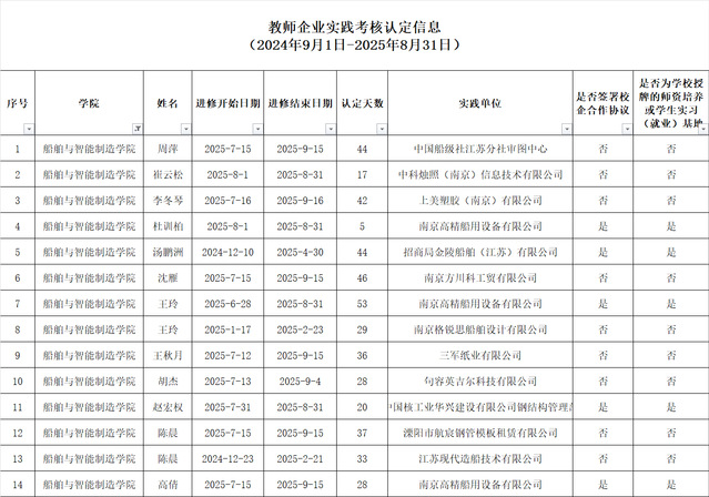 根据学校《关于组织教师企业实践考核认定工作的通知》要求,学院开展了教师企业实践鉴定。党政联席会审定了教师企业实践结果,具体考核认定时长明细如下图:
