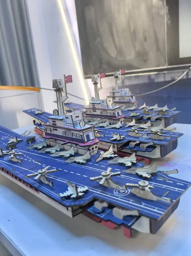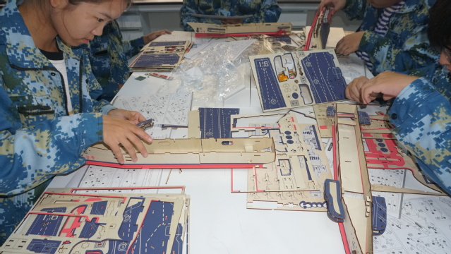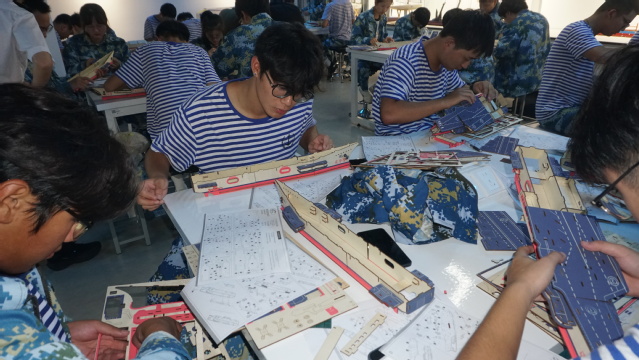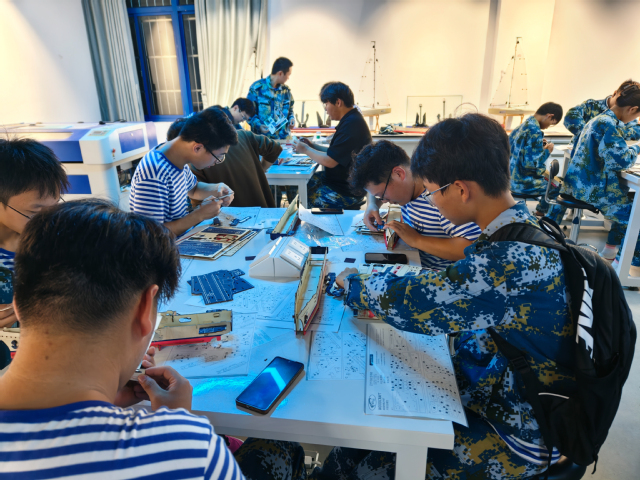 在模型制作环节,同学们分组协作,在筑梦深蓝红船社成员的悉心指导下,认真研读图纸、精细组装部件,一步步将航母模型从零件变为雏形。现场氛围专注而热烈,展现出同学们扎实的专业素养与团队协作能力,仿佛将课堂实训延伸至创意实践的舞台。