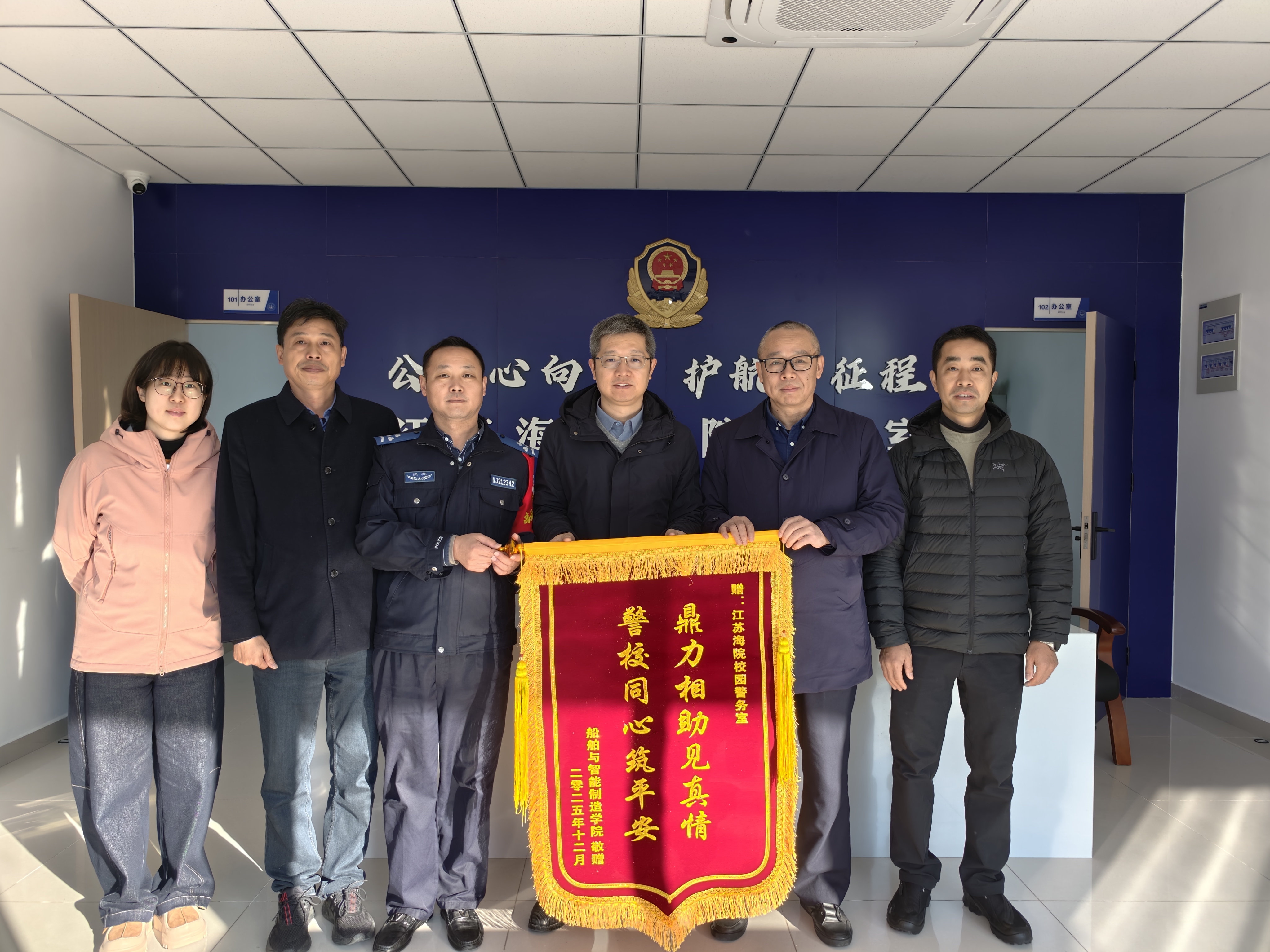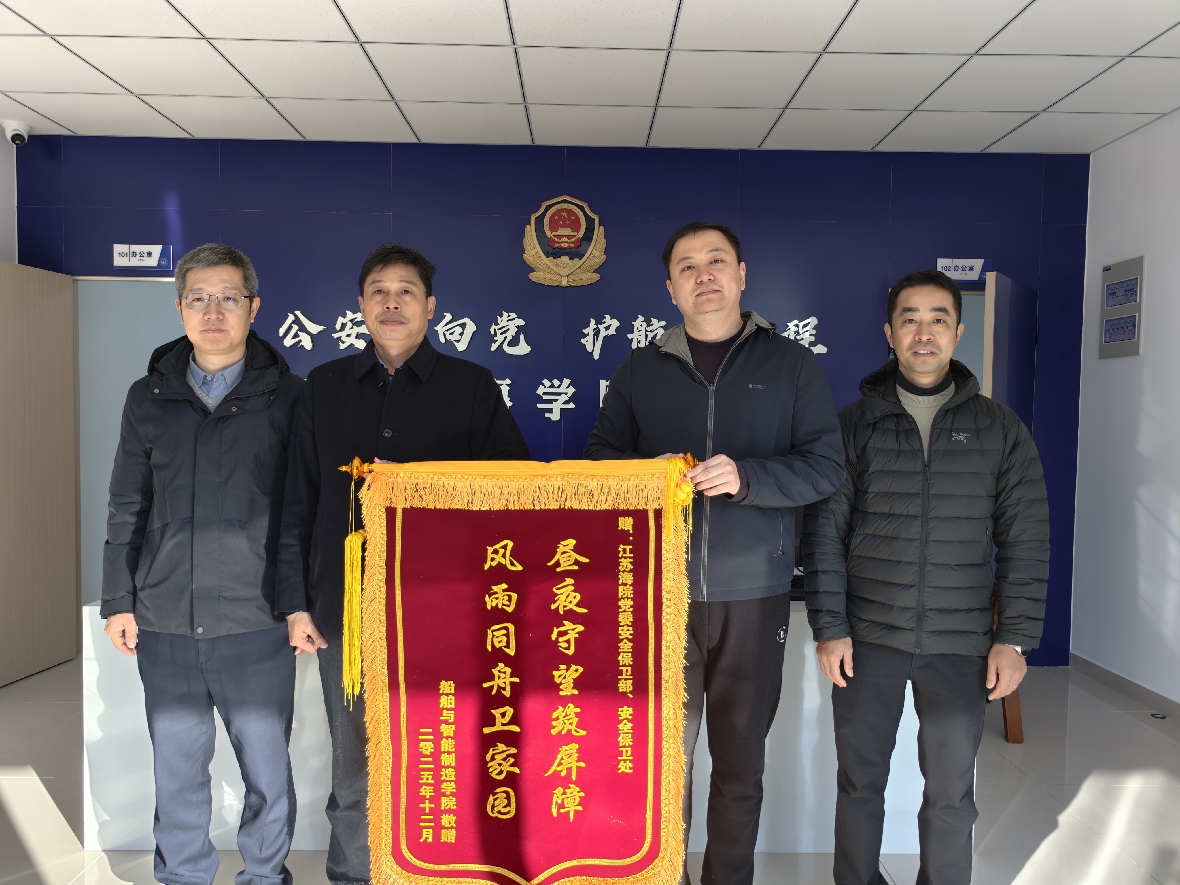 2025年12月3日,船舶学院党总支书记胡杰、副书记戴雪头一行代表学院,向学校安保部门及校园警务室赠送两面锦旗,以感谢其对学院师生安全与校园秩序的坚实守护。