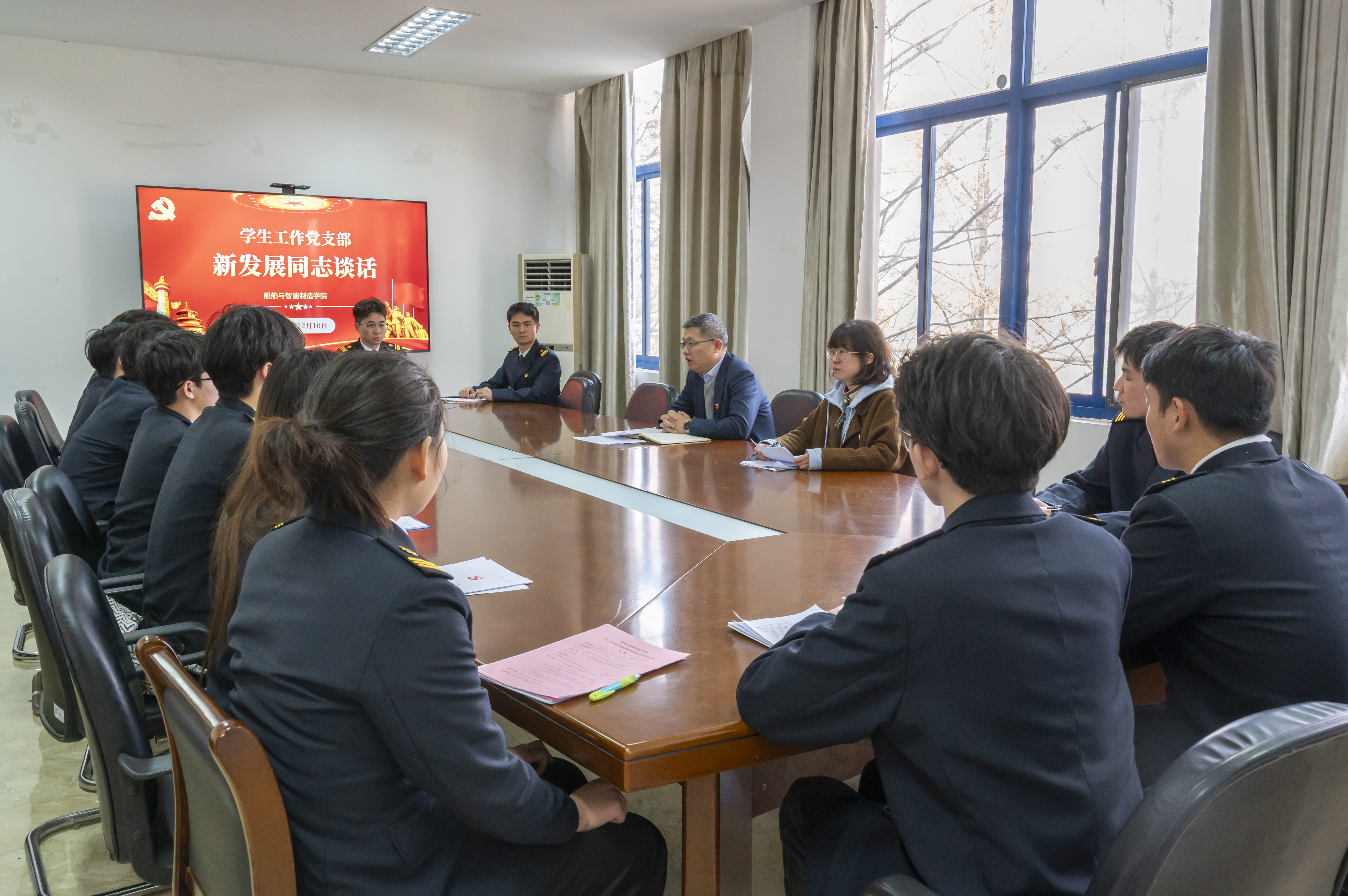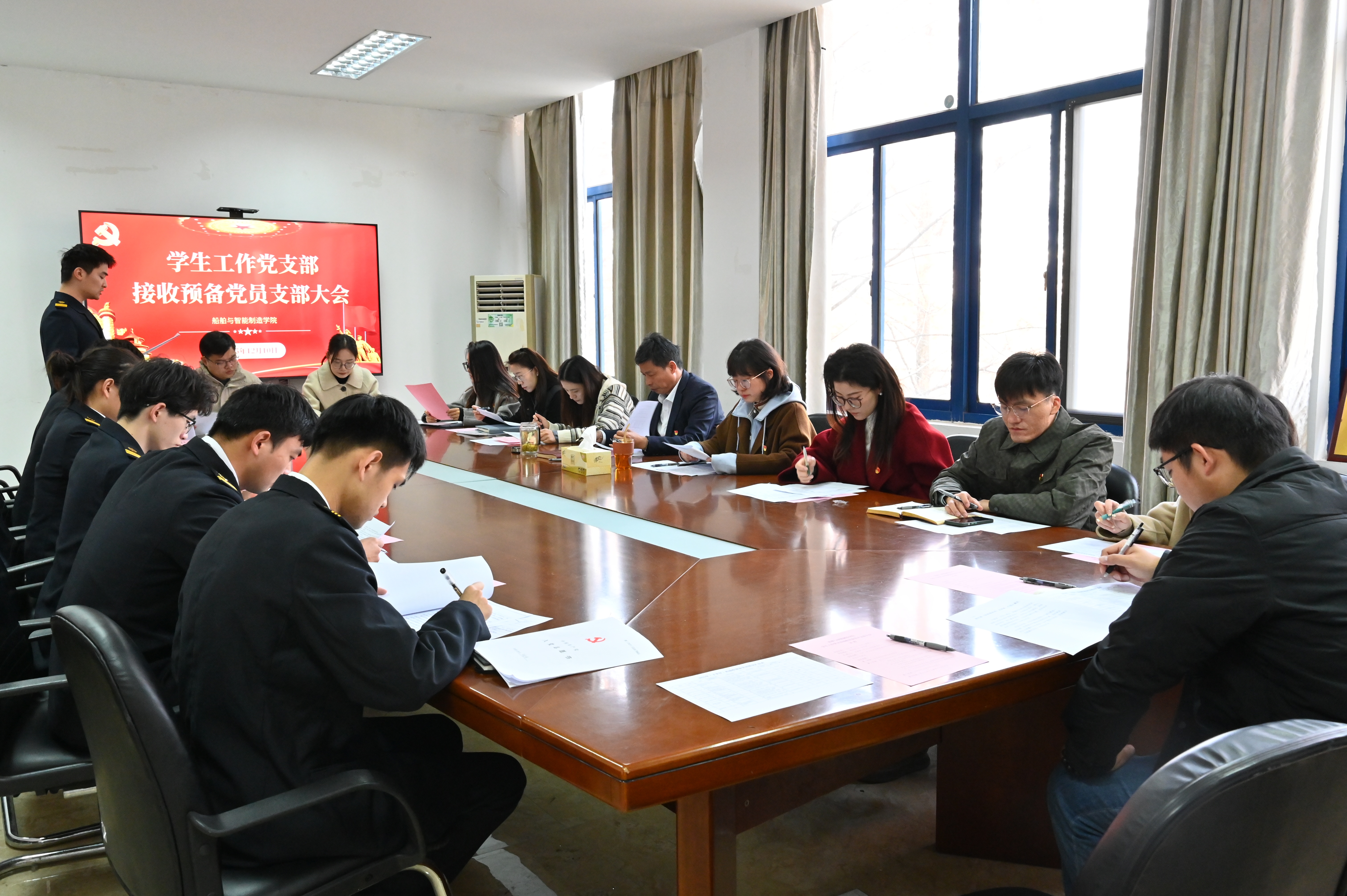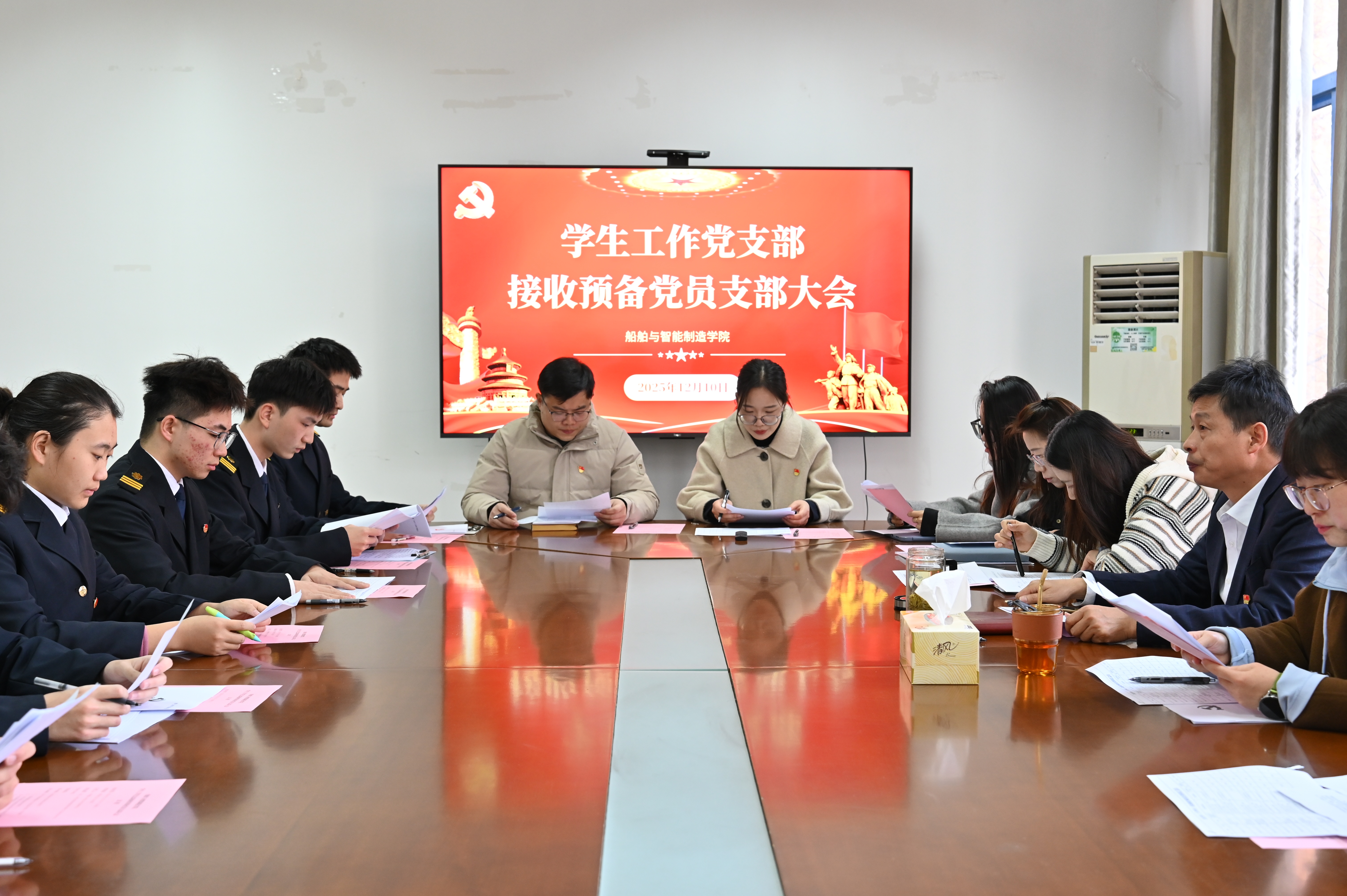 2025年12月10日上午,船舶与智能制造学院学生工作党支部在敏行楼201会议室召开2025年度接收预备党员支部大会,专题讨论周岳等十五名同志的入党问题。支部全体正式党员参加会议。