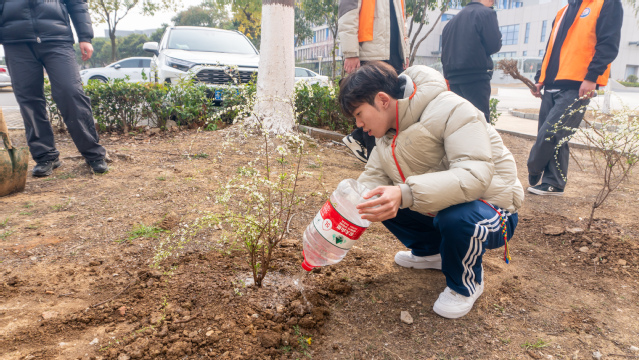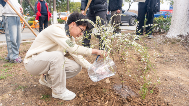 师生们率先在学院门口开展植树活动,大家自发分组、分工协作,挖坑、扶苗、培土、踩实、浇水,每一个步骤都有条不紊、细致认真。扶苗定根的专注,挥锹铲土的默契,提水浇灌的用心,师生们齐心协力将一棵棵小树苗稳稳栽种,让清新绿意绽放在校园门口,成为学院春日里一道别致的风景线。